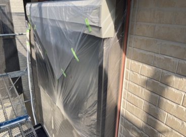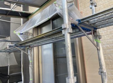 このように窓などを塗料で汚れないようにビニールで覆っていきます!このビニールが取れる段階まで工事が進むまで窓の開閉は基本的にはできなくなってしまいます!