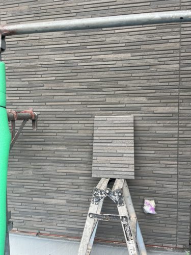 ニチハのパルムボーダー調GSシリーズは表面に多彩模様がついていますが今回は各色を合わせて表面は黒系のボカシで再現しています。施工中もお施主さんと打ち合わせをして全体で見た時に各色の色味をだしたいとのご要望でしたので見本よりは少し明るめで施工しています。