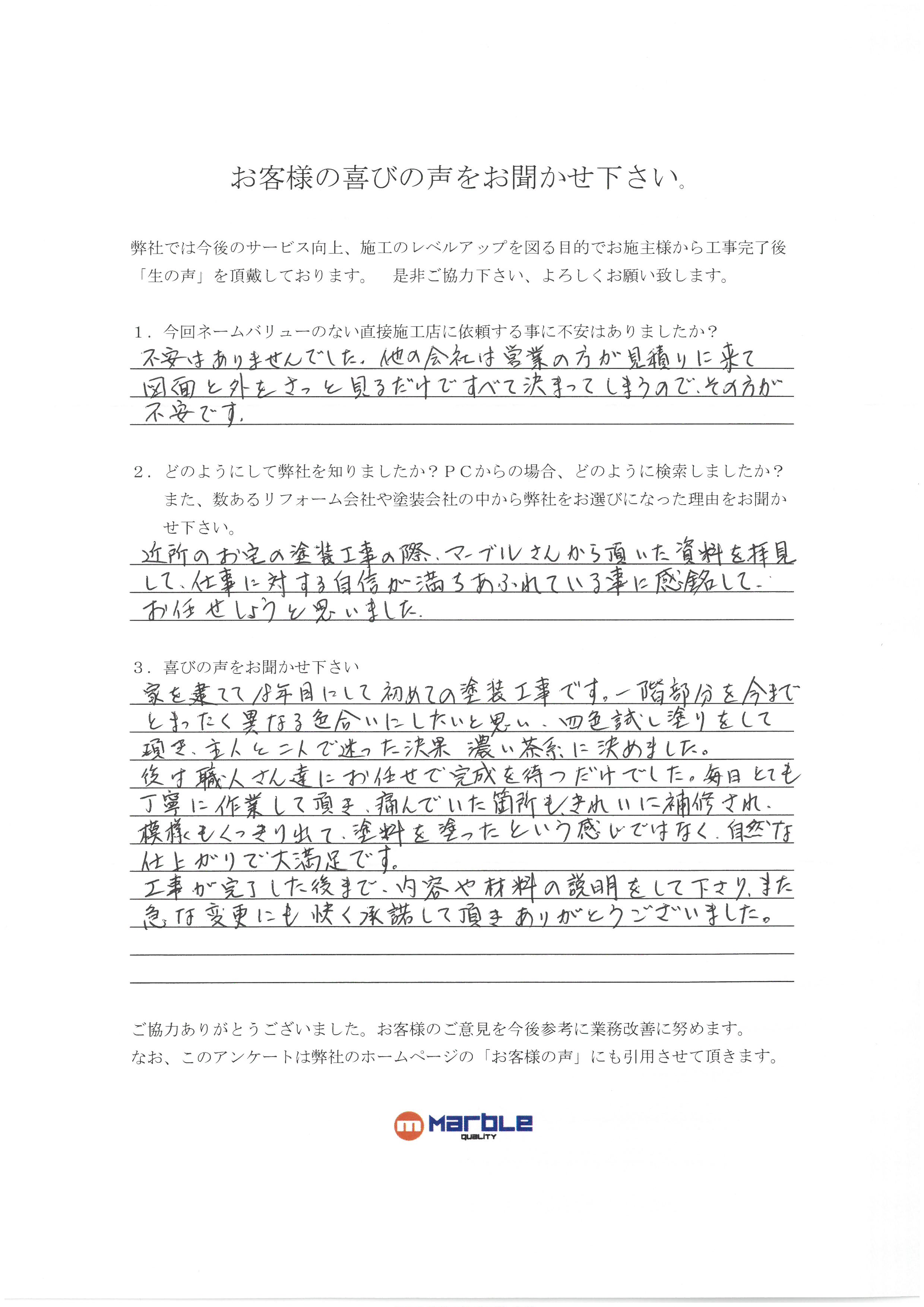 近所のお宅の塗装工事の際、マーブルさんから頂いた資料を拝見して、仕事に対する自信が満ち溢れている事に感銘して、お任せしようと思いました。