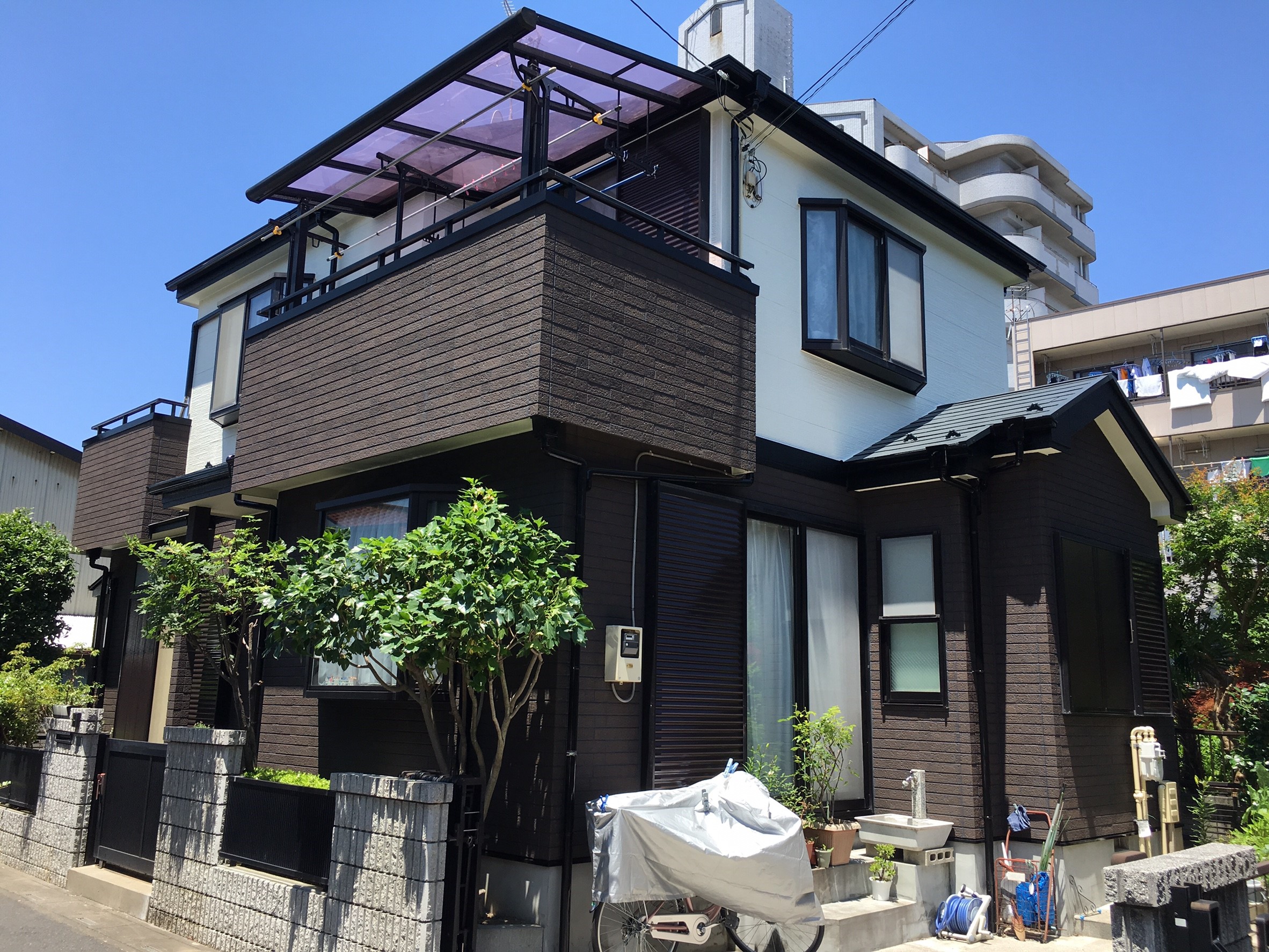 1階部分を今までとは全く異なる色合いにしたいと思い、4色試し塗りをして頂き、主人と二人で迷った結果濃い茶色に決めました。