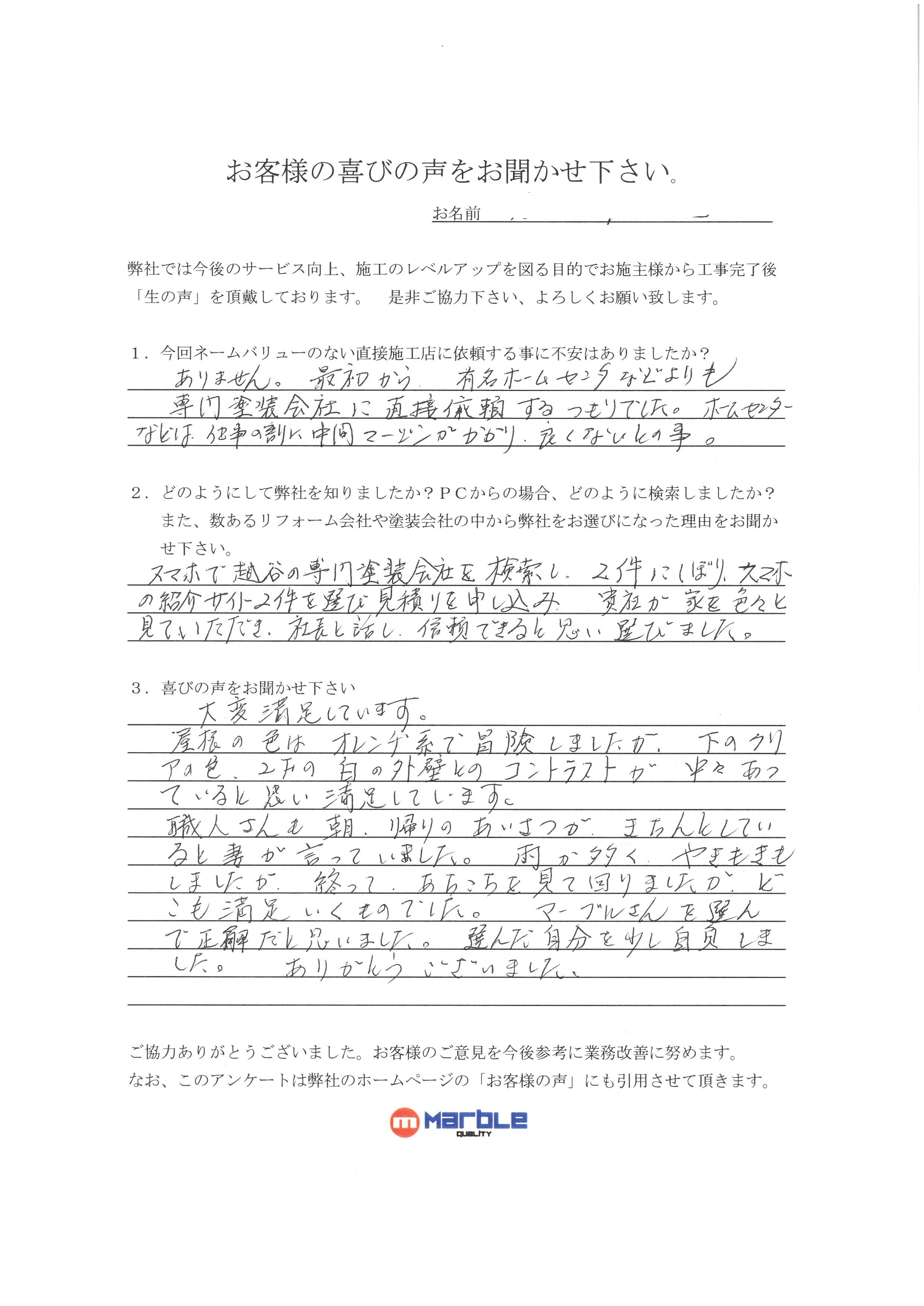 スマホで越谷の専門塗装会社を検索し2件にしぼり、スマホの紹介サイト2件を選び見積もりを申し込み、貴社が家を色々と見て頂き社長と話し、信頼できると思い選びました。