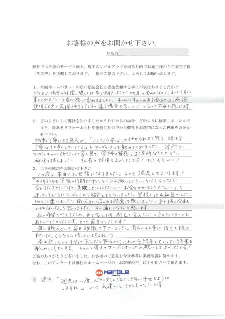 この度は本当にお世話になりました。とても満足しております!「そろそろウチも塗装の時期だけど、どこにお願いしよう・・・どこもそんなに変わり無さそうだけど、失敗したくないし・・・お金掛る事だし・・・」と迷っているところにマーブルさんを紹介して貰いました。