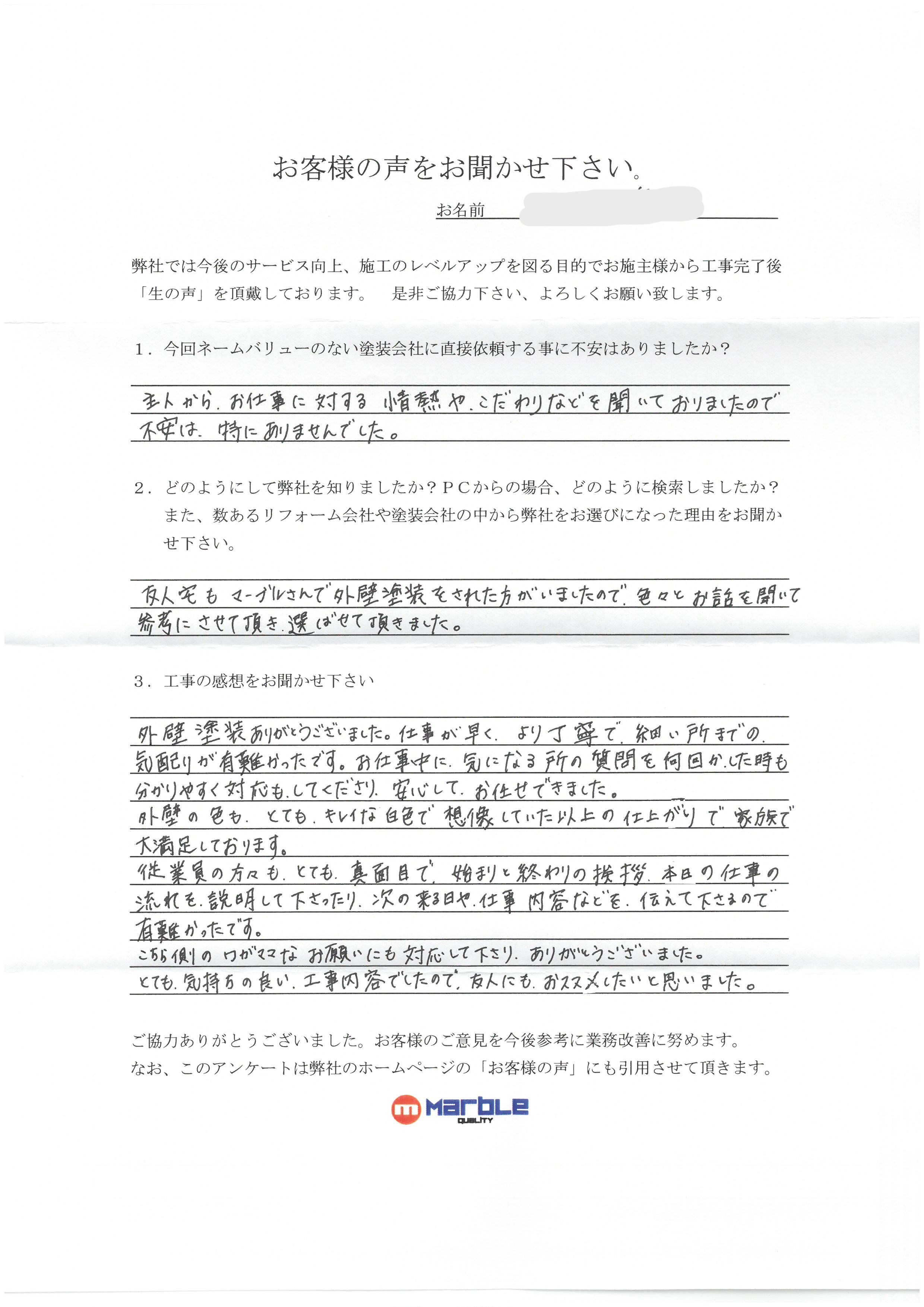 友人宅もマーブルさんで外壁塗装をされた方が居ましたので、色々とお話を聞いて参考にさせて頂き選ばせて頂きました。工事の感想をお聞かせください。