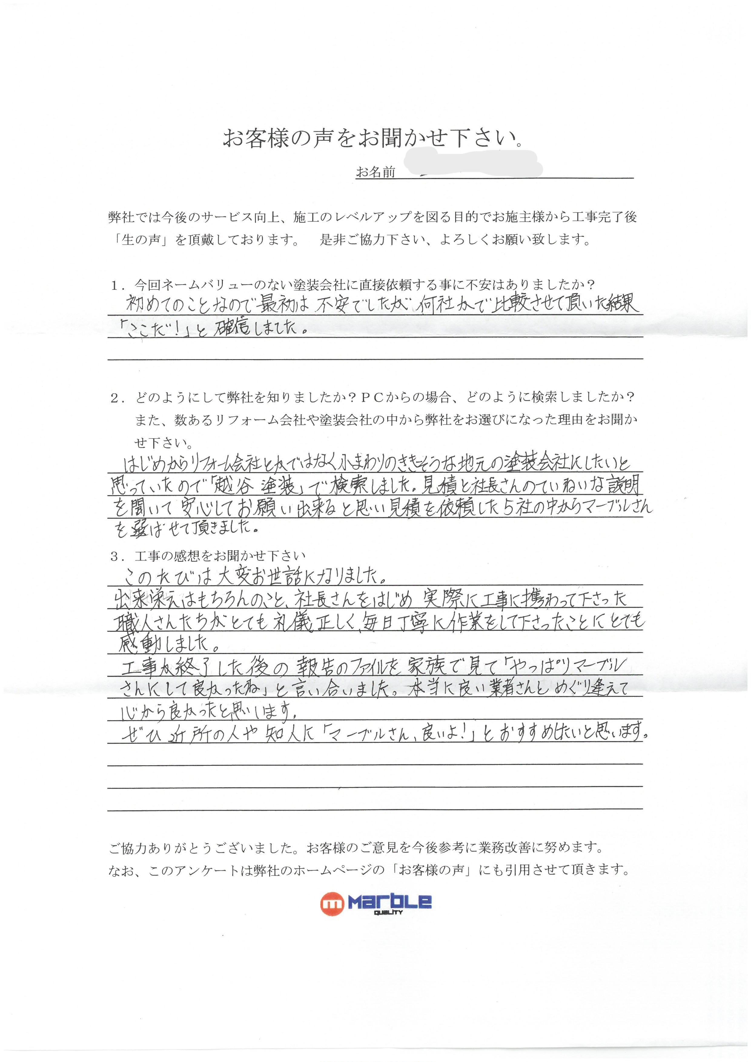はじめからリフォーム会社とかでは無く、小回りの利きそうな地元の塗装会社にしたいと思っていたので「越谷 塗装」で検索しました。見積りと社長さんの丁寧な説明を聞いて安心してお願い出来ると思い、見積もりを依頼した5社の中からマーブルさんを選ばせて頂きました。