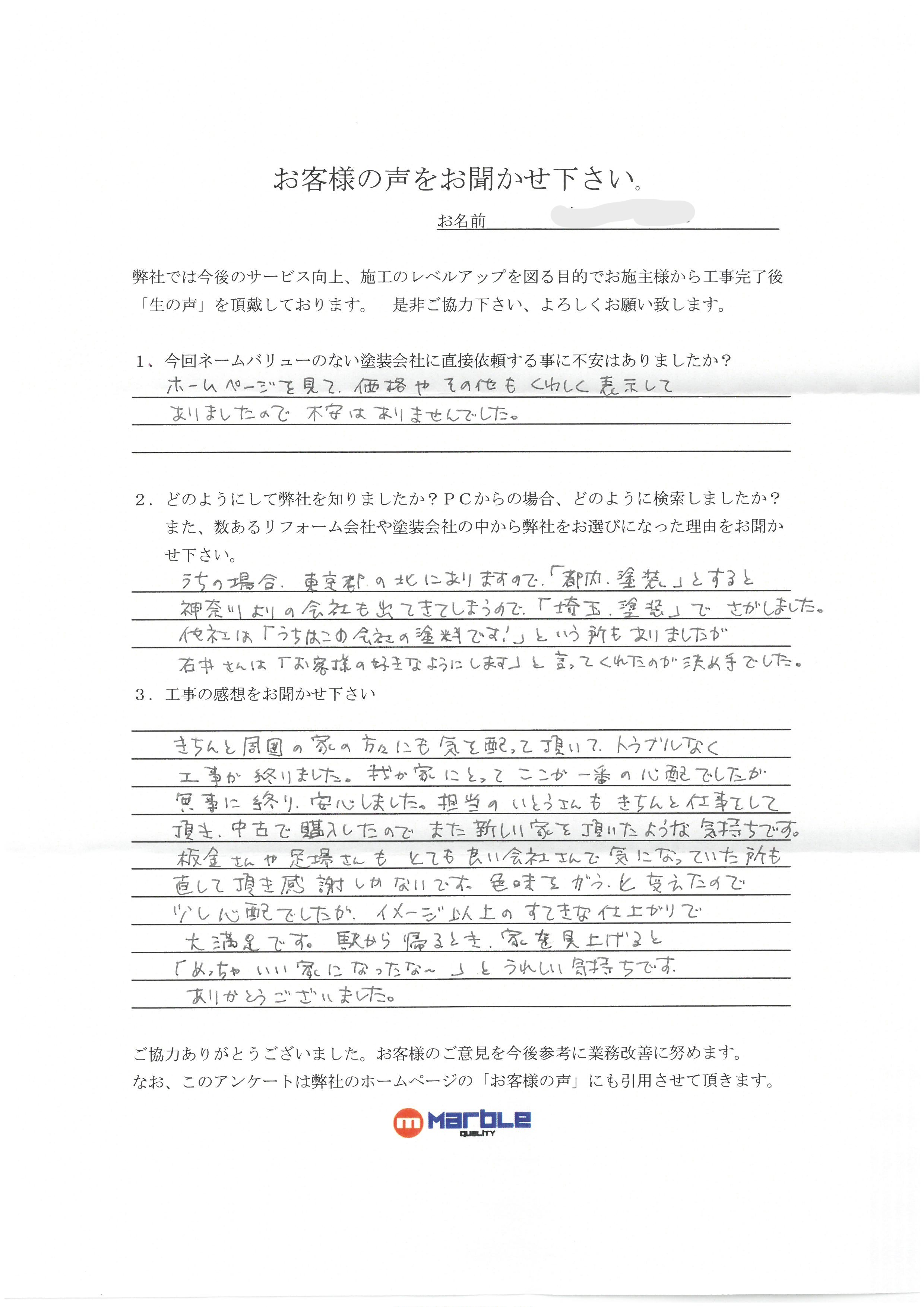 ウチの場合、東京都の北にありますので「都内・塗装」とすると神奈川寄りの会社も出て来てしまうので「埼玉・塗装」で探しました。他社は「ウチはこの会社の塗料です!」という所もありましたが、石井さんは「お客様の好きなようにします」と言ってくれたのが決め手でした。