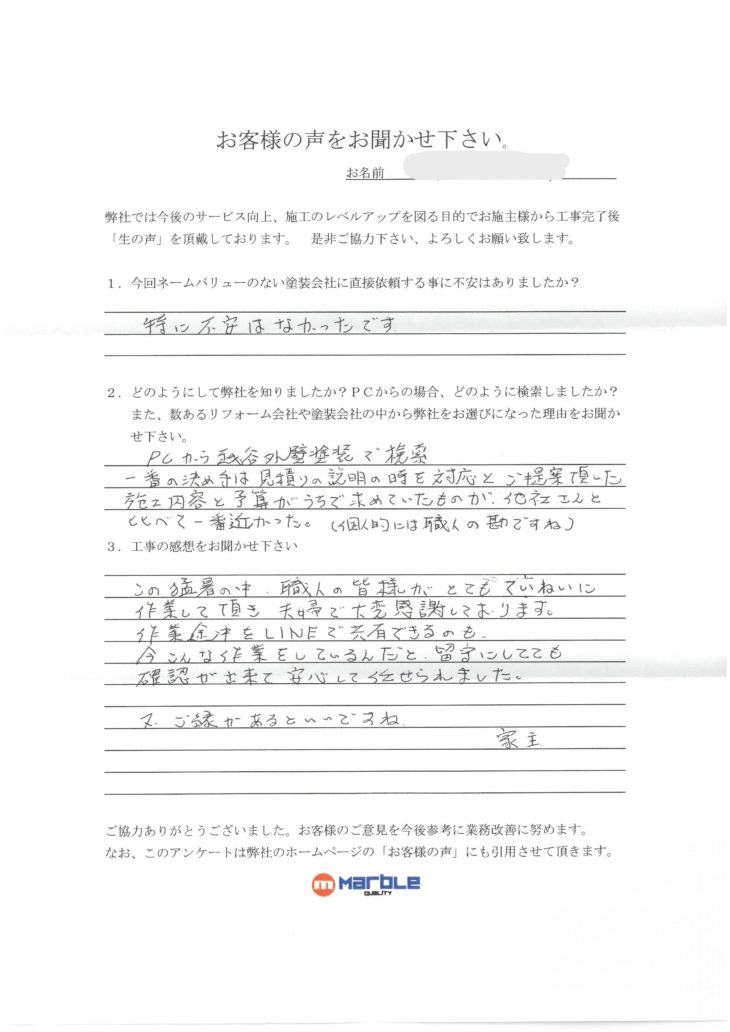特に不安はありませんでした。どの様にして弊社を知りましたか?PCからの場合どの様に検索しましたか?また、数あるリフォーム会社や塗装会社の中から弊社をお選びになった理由をお聞かせください。