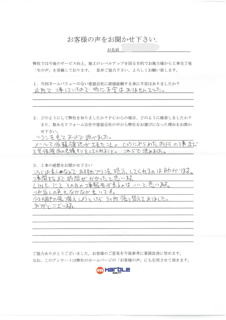 近所で工事していたので特に不安はありませんでした。どの様にして弊社を知りましたか?PCからの場合どの様に検索しましたか?また、数あるリフォーム会社や塗装会社の中から弊社をお選びになった理由をお聞かせください。