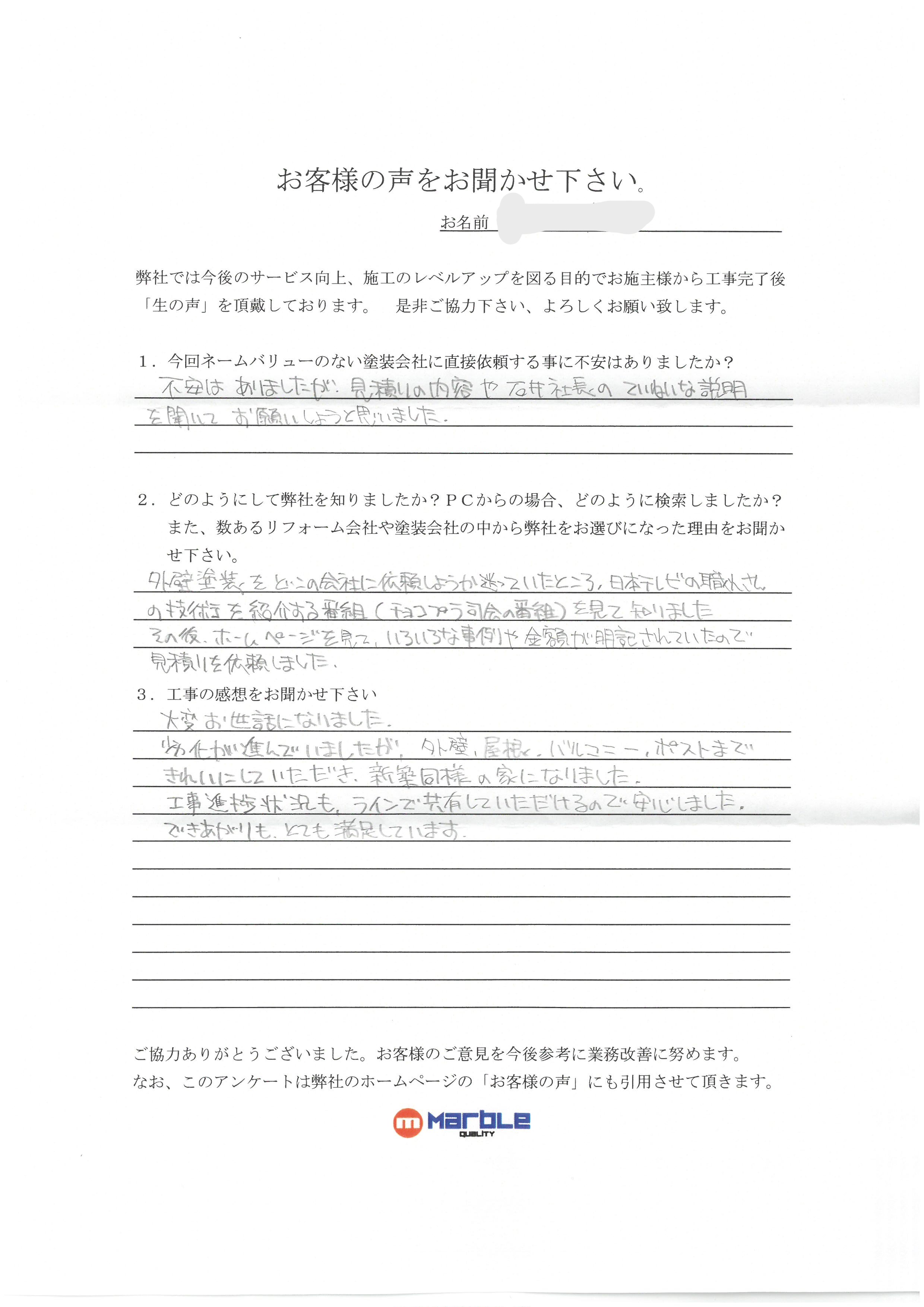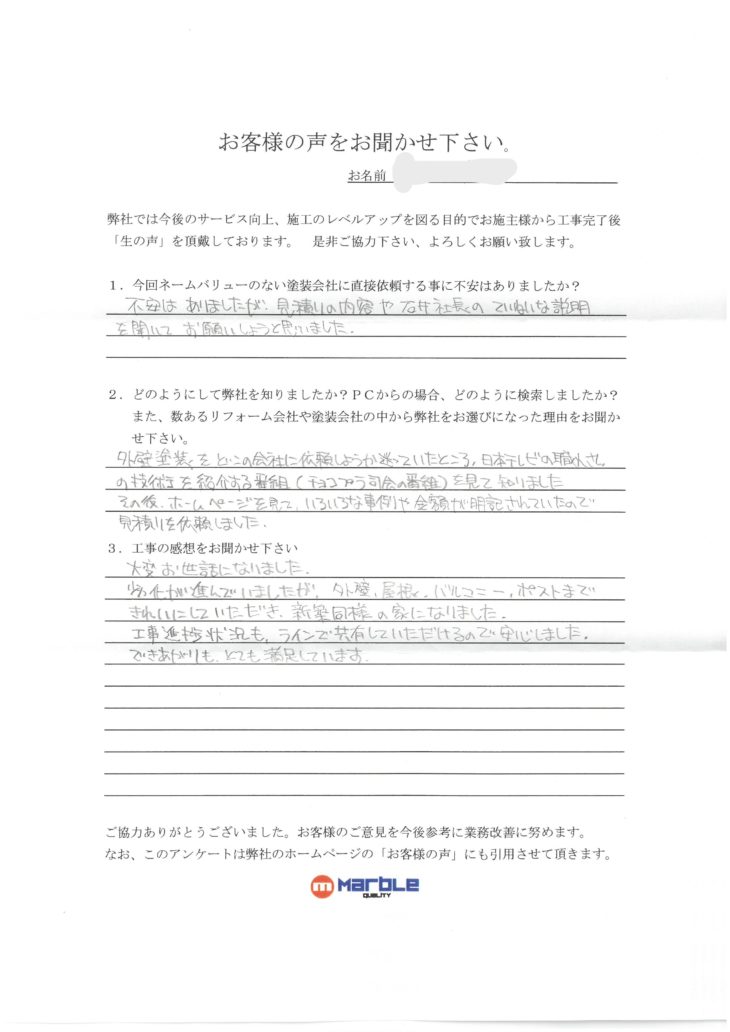 不安はありましたが、見積りの内容や石井社長の丁寧な説明を聞いてお願いしようと思いました。どの様にして弊社を知りましたか?PCからの場合どの様に検索しましたか?また、数あるリフォーム会社や塗装会社の中から弊社をお選びになった理由をお聞かせください。
