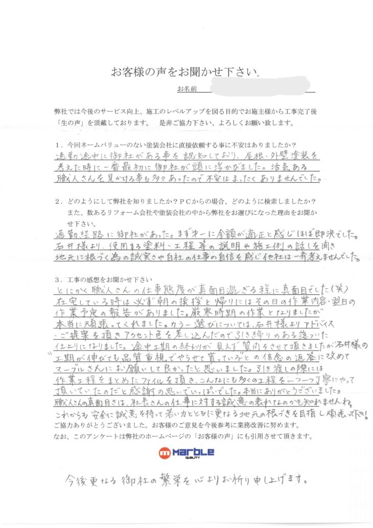 通勤途中に御社がある事を認知しており、屋根・外壁塗装を考えた時に一番最初に御社が頭に浮かびました。活気ある職人さんを見掛ける事も多々あったので不安はまったくありませんでした。