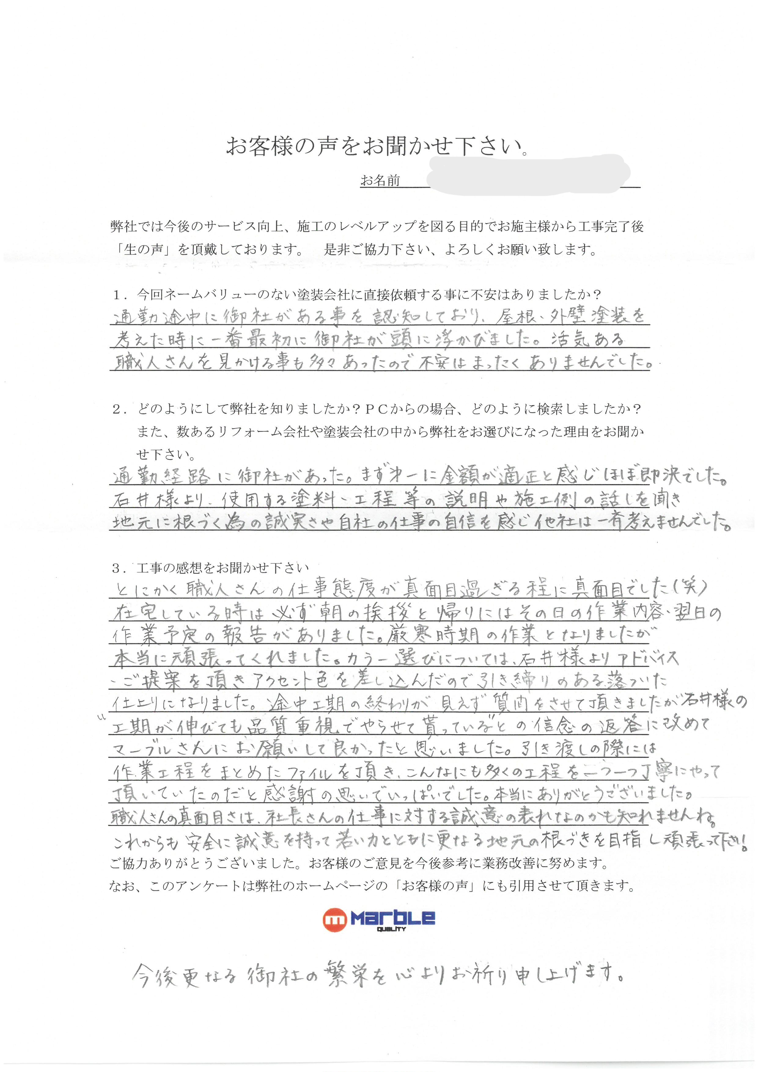 石井様より使用する塗料、工程等の説明や施工例の話を聞き、地元に根づく為の誠実さや自社の仕事の自信を感じ他社は一斉考えませんでした。