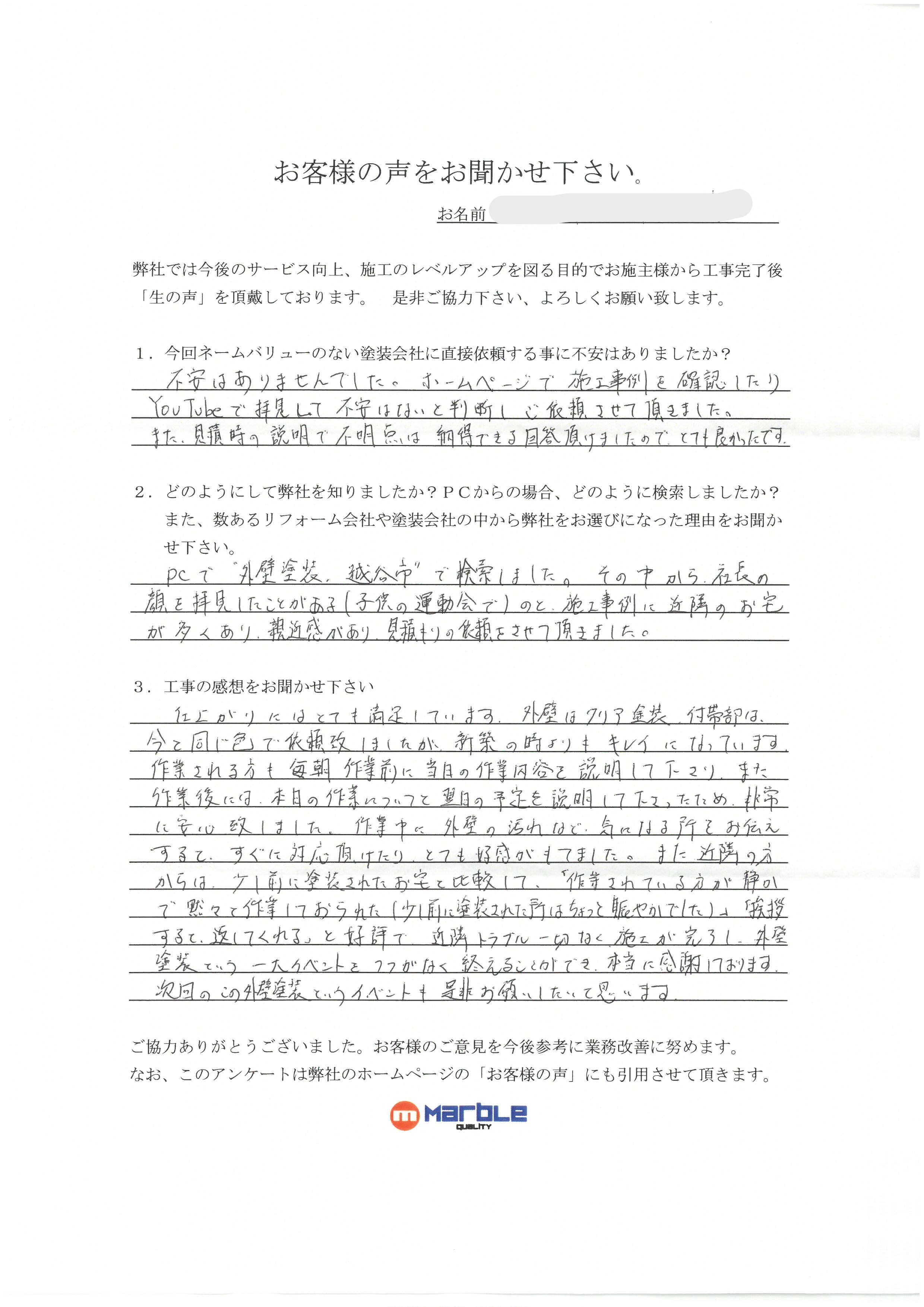 PCで「外壁塗装、越谷市」で検索しました。その中から社長の顔を拝見した事がある(子供の運動会で)のと、施工事例に近隣のお宅が多くあり、親近感があり見積もりの依頼をさせて頂きました。