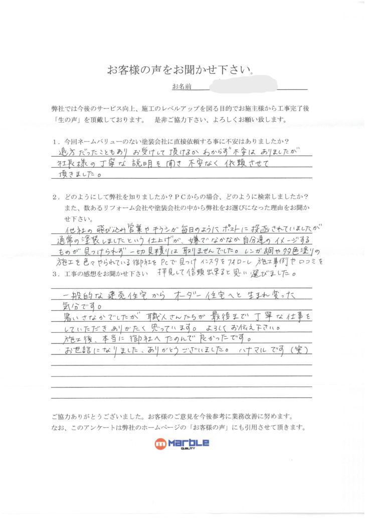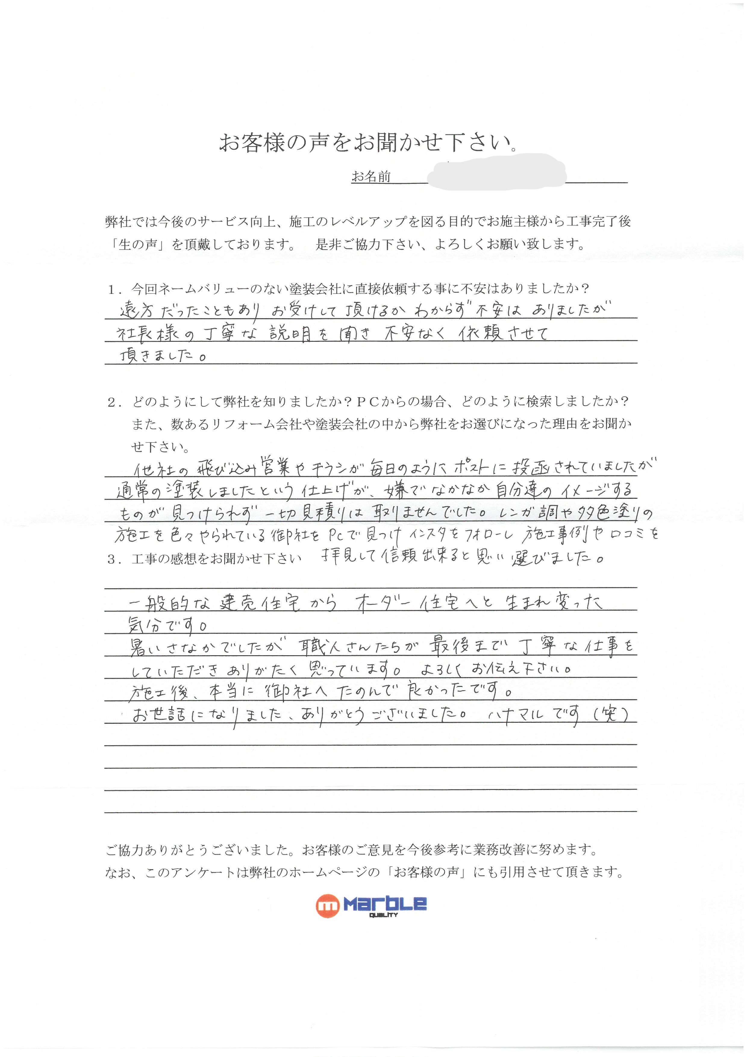 他社の飛び込み営業やチラシが毎日のようにポストに投函されていましたが、通常の塗装しましたという仕上げが嫌で、なかなか自分達のイメージするものが見付けられず、一切見積もりは取りませんでした。レンガ調や多色塗りの施工を色々やられている御社をPCで見つけインスタフォローし、施工事例や口コミを拝見して信頼出来ると思い選びました。