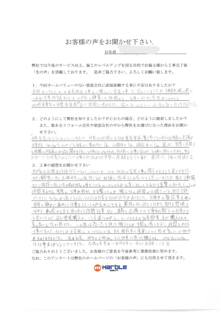 当初はハウスメーカーの延長保証工事の一環として塗装工事を考えてましたが、当事者意識の感じられない営業担当者、及びメーカーの対応に辟易した経緯から、仕事に対する覚悟が伺える、地域密着型の外壁塗装専門店に依頼を決めました。故にネームバリューは全く気になりませんでした。