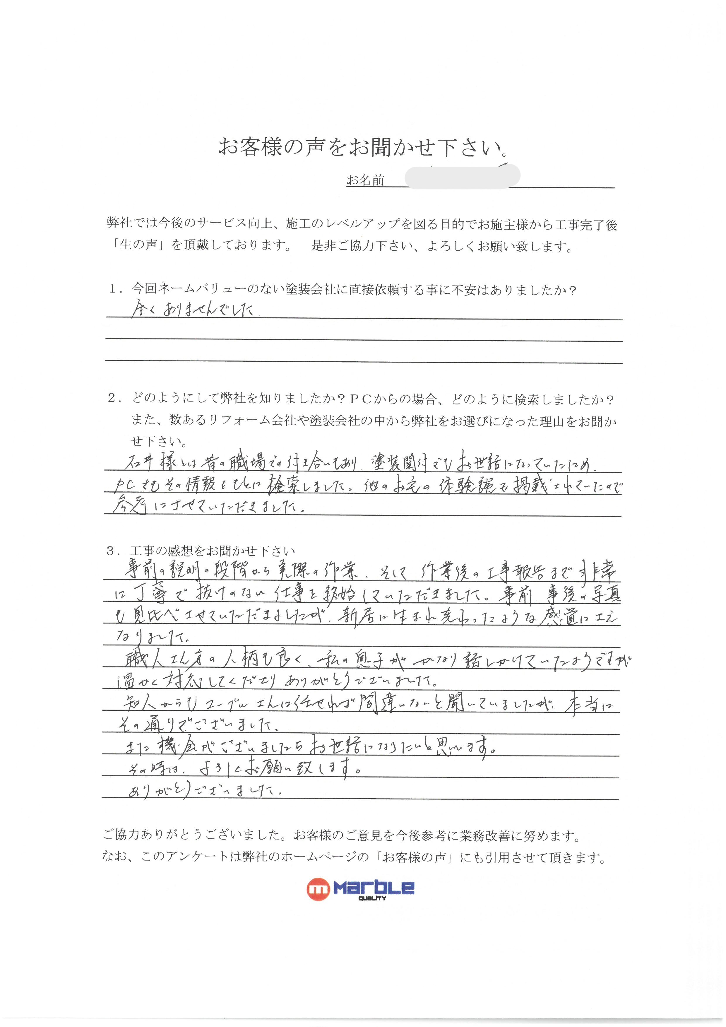 石井様とは昔の職場での付き合いもあり、塗装関係でもお世話になっていたため、PCでもその情報を元に検索しました。他のお宅の体験談も掲載されていたので参考にさせていただきました。