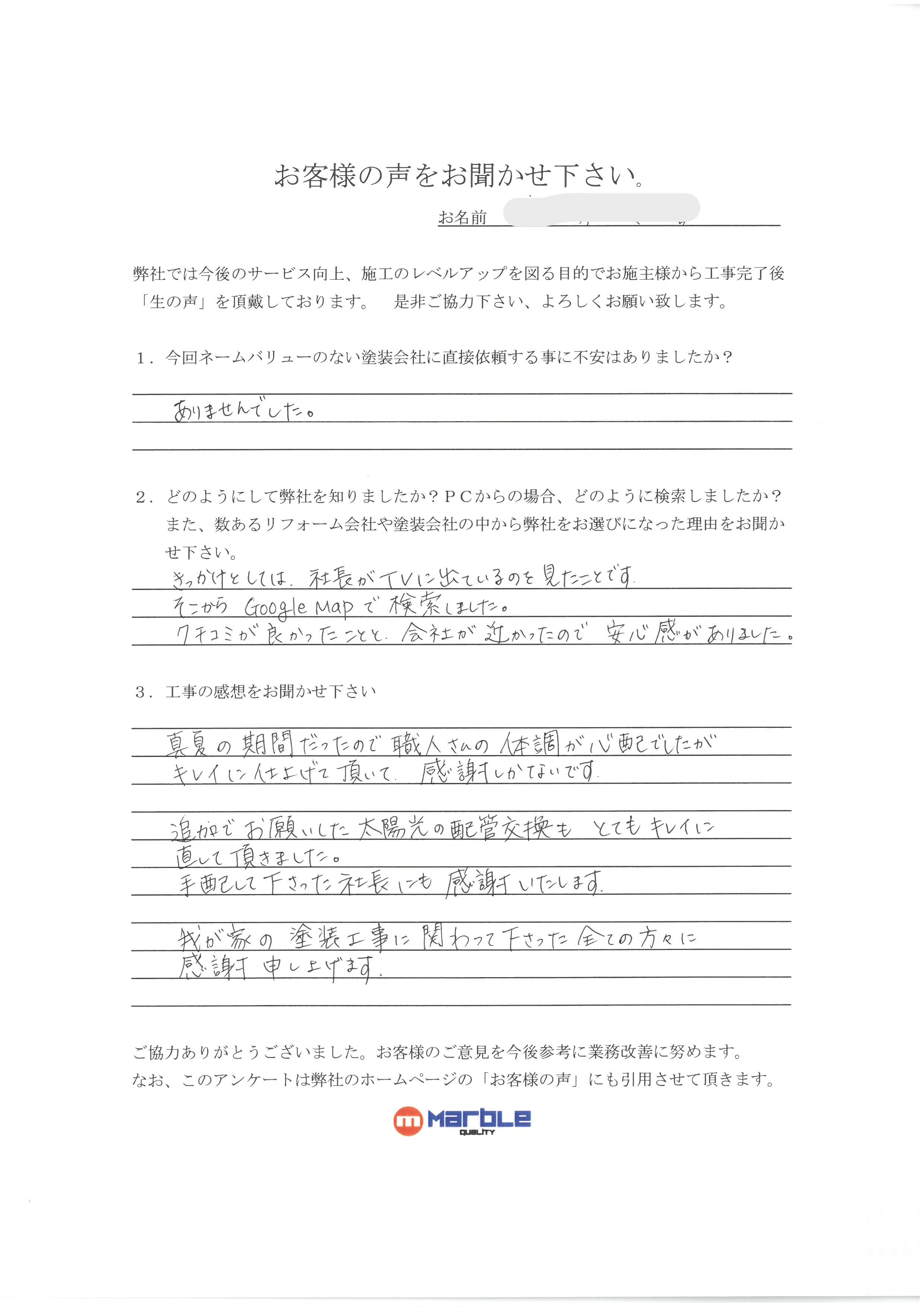 真夏の期間だったので職人さんの体調が心配でしたが、キレイに仕上げて頂いて感謝しかないです。追加でお願いした太陽光の配管交換もとてもキレイに直して頂きました。