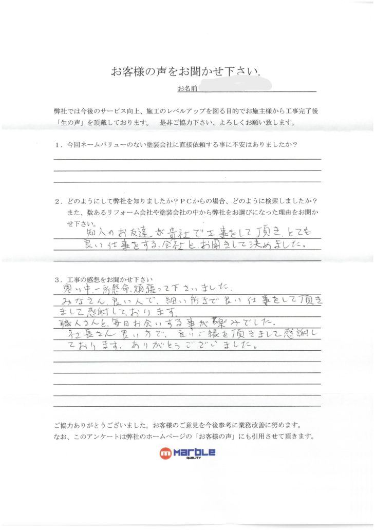 HOMEお客様の声越谷市北越谷 M様の声 越谷市北越谷 M様の声 全体的なご満足度は? 5/5 担当者のマナーは?大変満足 職人のマナーは?大変満足 どの様にして弊社を知りましたか?また、数あるリフォーム会社や塗装会社の中から弊社をお選びになった理由をお聞かせ下さい。 知人のお友達が貴社で工事をして頂き、とても良い仕事をする会社とお聞きして決めました。 工事の感想をお聞かせください。 寒い中、一生懸命頑張って下さいました。みなさん良い人で、細かい所まで良い仕事をして頂きまして感謝しております。職人さんと毎日お会いする事が楽しみでした。社長さん良い方で、良いご縁を頂きまして感謝しております。ありがとうございました。 担当スタッフ 担当スタッフ 代表 石井 M様 この度は大変お世話になりました。 昨今尋常ではない強さの風が吹く日が多く、さぞご心配であったと思います。 屋根材が玄関先に落下したのが工事に踏み切った最大の原因でしたね? お怪我する前に修繕が完了して本当に良かったです。 「安心住宅」で末永くお幸せな毎日をお過ごしください。 ありがとうございました。 実際の施工事例はこちら お客様の声一覧はこちら マーブルについて マーブルのこだわり 会社案内代表挨拶会社概要企業理念アクセスマップペンキ屋マー坊チャンネルハナマル職人紹介 ハナマル施工事例 ハナマル施工事例一覧 外壁塗装 屋根塗装 屋根葺き替え 屋根のカバー工法 レンガ調塗装(彩ディングコートシリーズ) ポラス 博進 飯田グループ その他メーカー お客様の声 お客様の声一覧 ハナマル塗装オプション サイディング多色塗り 彩ディングコートシリーズ 【彩ディングDXコート】 ¥3,850/㎡(税込) 塗装工事 「じぶんち塗っちゃおう!」ワクワク♫チビッ子塗装体験♡ ¥0(税込) 屋根工事 【新工法】接着式スレート屋根専用カバー工法 「Cガード」 ¥6,600/㎡~(税込) その他 ワンポイントに最適!【オリジナルイラスト塗装】 ¥11,000/箇所~(税込) ハナマル塗装オプション一覧 サイディング多色塗り 塗装工事 屋根工事 その他 ハナマルブログ ハナマルブログ一覧 ハナマル親方ブログ ハナマル職人ブログ イベント・チラシ情報 イベント・チラシ情報一覧 チラシ イベント お役立ち情報 ハナマル塗料とお金の目安 リフォームの流れ よくある質問 イベント・チラシ情報 お問い合わせ お問い合わせ 無料お見積もり トップ 会社案内 マーブルのこだわり 会社案内代表挨拶会社概要企業理念アクセスマップペンキ屋マー坊チャンネルハナマル職人紹介 ペンキ屋マー坊 Youtubeチャンネル ハナマル施工事例 ハナマル施工事例一覧 外壁塗装 屋根塗装 屋根葺き替え 屋根のカバー工法 レンガ調塗装(彩ディングコートシリーズ) ポラス 博進 飯田グループ その他メーカー お客様の声 お客様の声一覧 ハナマル塗装オプション ハナマル塗装オプション一覧 サイディング多色塗り 塗装工事 屋根工事 その他 ハナマルブログ ハナマルブログ一覧 お役立ち情報 ハナマル塗料とお金の目安リフォームの流れよくある質問イベント・チラシ情報 お問い合わせ お問い合わせ無料お見積もり © 2021 株式会社マーブル