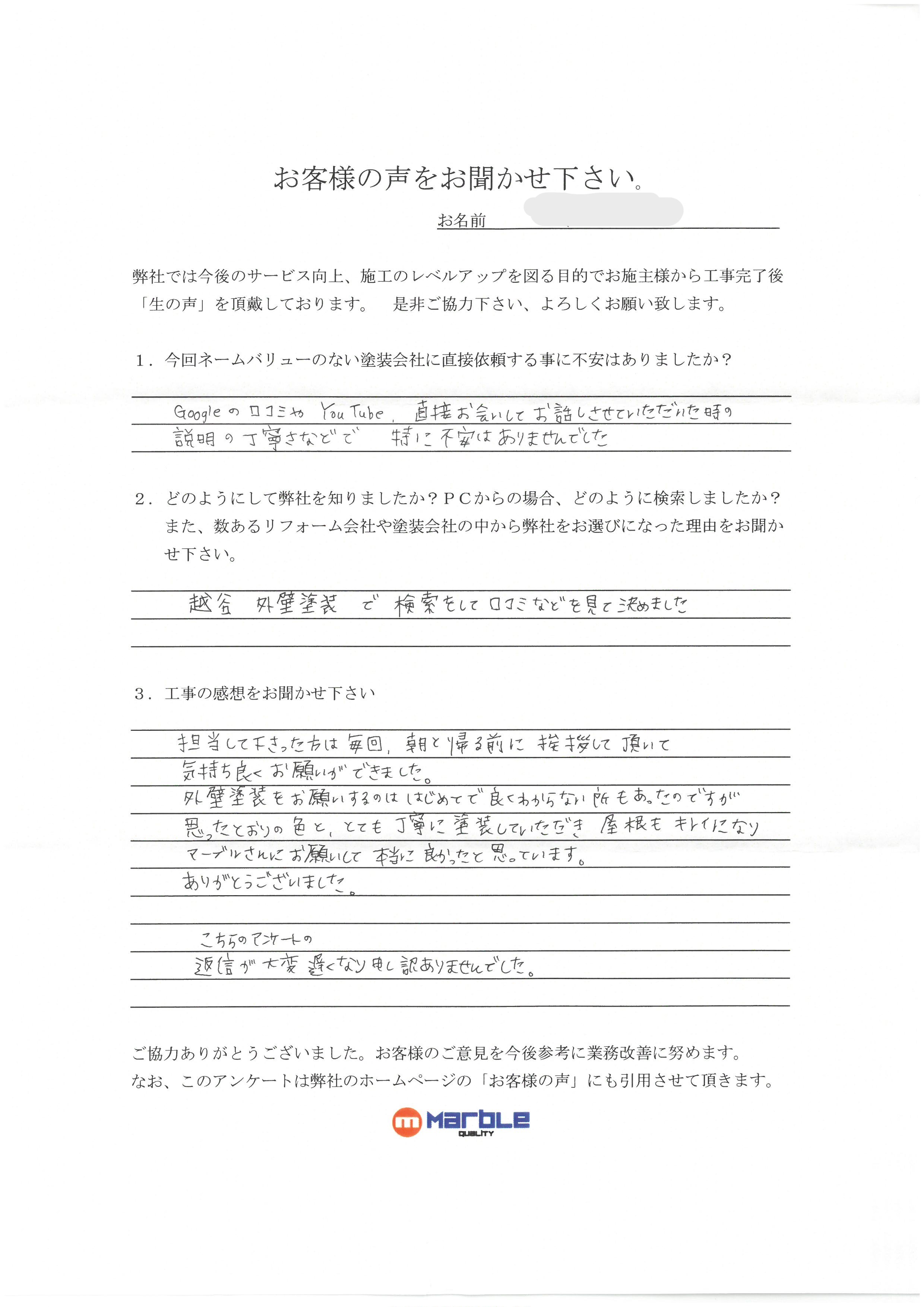 「越谷 外壁塗装」で検索をして、口コミなどを見て決めました。工事の感想をお聞かせください。