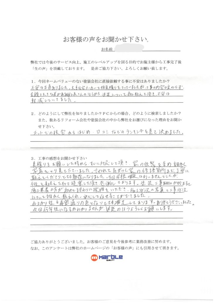 どの様にして弊社を知りましたか?PCからの場合どの様に検索しましたか?また、数あるリフォーム会社や塗装会社の中から弊社をお選びになった理由をお聞かせ下さい。