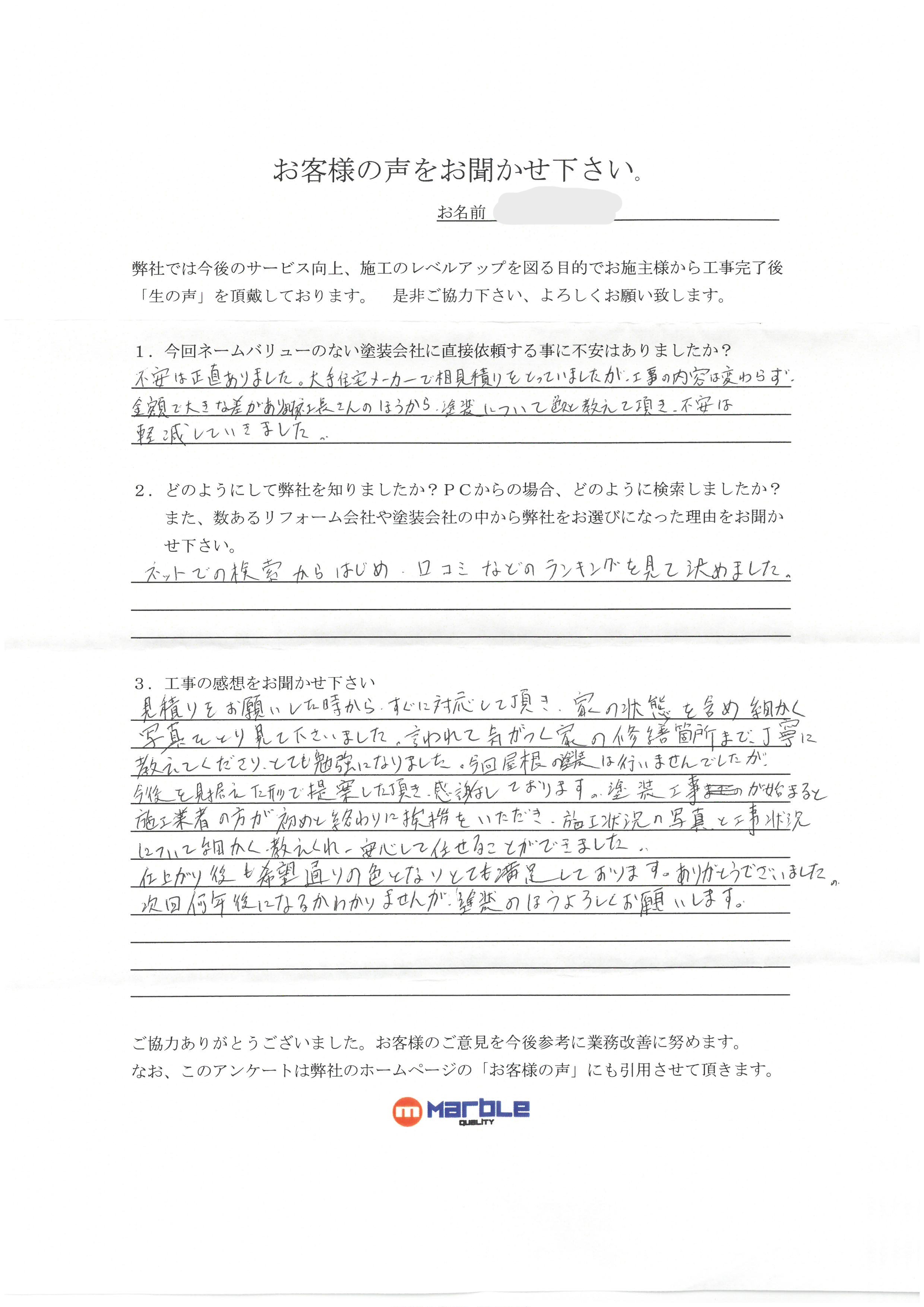 塗装工事が始まると施工業者の方が初めと終わりに挨拶を頂き、施工状況の写真と工事状況について細かく教えてくれ、安心して任せる事が出来ました。