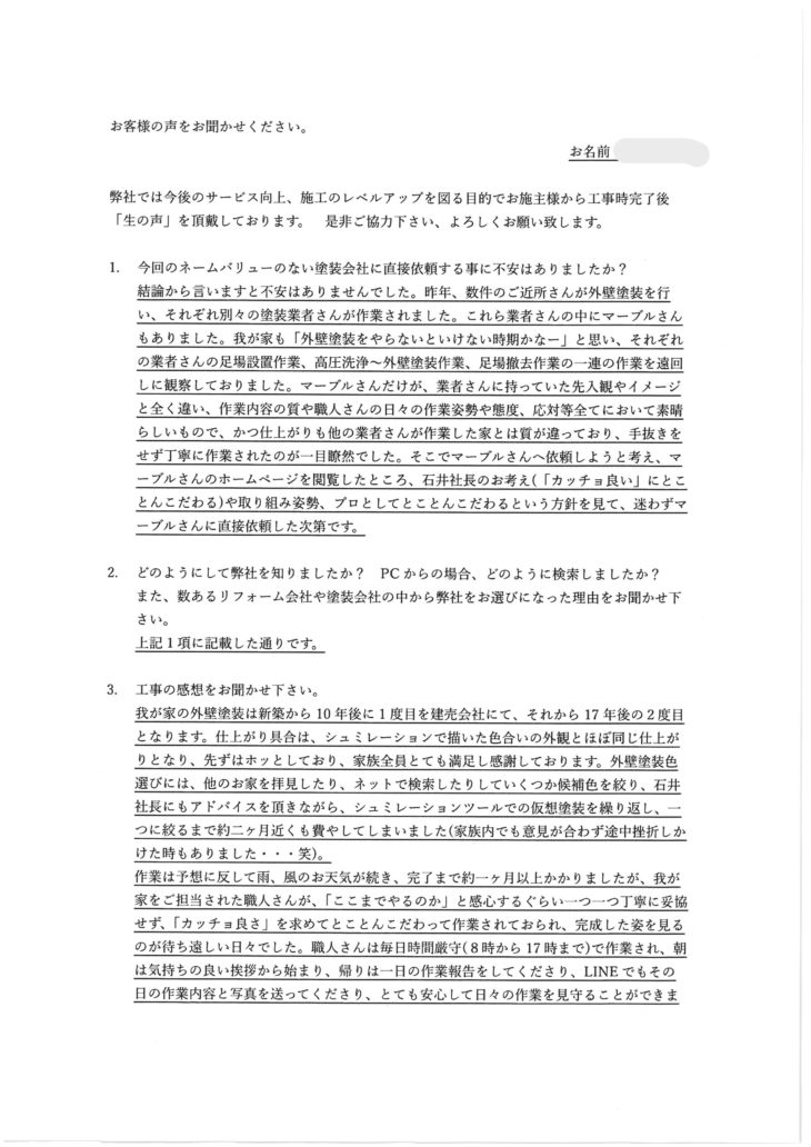 マーブルさんだけが、業者さんに持っていた先入観やイメージと全く違い、作業内容の質や職人さんの日々の作業姿勢や態度、応対等全てにおいて素晴らしいもので、かつ仕上がりも他の業者さんが作業した家とは質が違っており、手抜きをせず丁寧に作業されたのが一目瞭然でした。