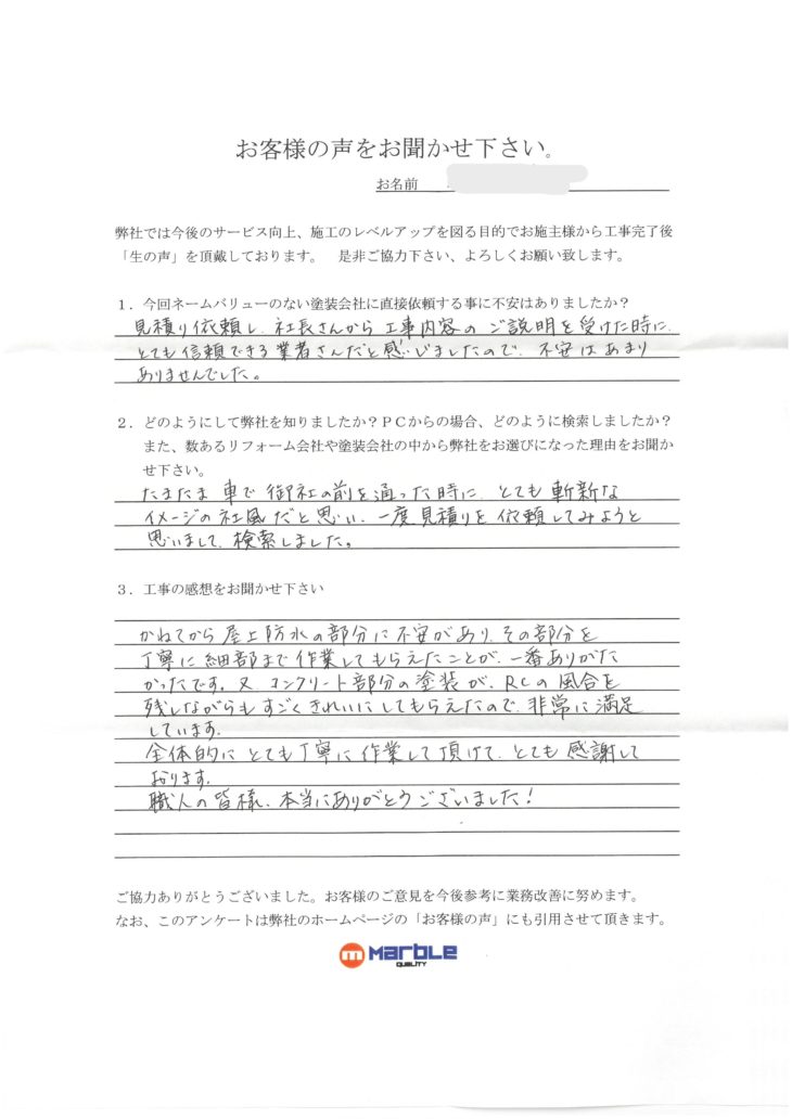 見積り依頼し、社長さんから工事内容のご説明を受けた時に、とても信頼出来る業者さんだと感じましたので、不安はありませんでした。どの様にして弊社を知りましたか?また、数あるリフォーム会社や塗装会社の中から弊社をお選びになった理由をお聞かせ下さい。