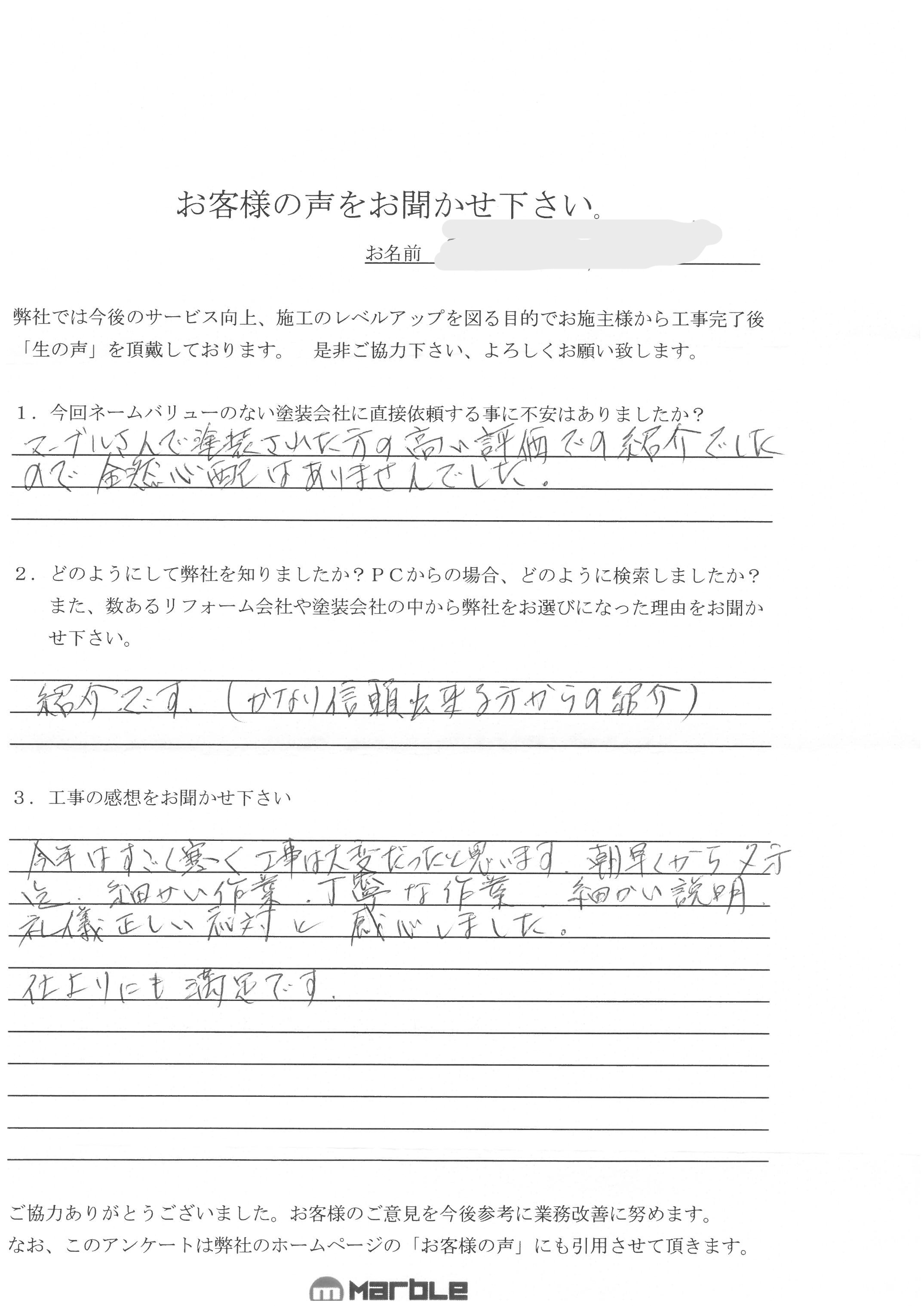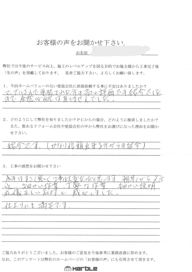 HOMEお客様の声吉川市吉川 T様の声 吉川市吉川 T様の声 全体的なご満足度は? 5/5 担当者のマナーは?大変満足 職人のマナーは?大変満足 今回ネームバリューの無い塗装会社に直接依頼する事に不安はありましたか? マーブルさんで塗装された方の高い評価での紹介でしたので、全然心配はありませんでした。 どの様にして弊社を知りましたか? 紹介です。(かなり信頼出来る方からの紹介) 工事の感想をお聞かせください。 今年はすごく寒く、工事は大変だったと思います。朝早くから夕方迄、細かい作業、丁寧な作業、細かい説明、礼儀正しい対応と感心しました。仕上りにも満足です。 担当スタッフ 担当スタッフ 代表 石井 T様 この度は大変お世話になりました。 担当職人に対する労いのお言葉、誠にありがとうございました。 前回工事した施工者の曖昧な処理を、試行錯誤しながらキレイに収めていましたので、この様なお言葉は沁みる事と思われます。 ご紹介頂いた方へもお礼と、完了の報告を致しましたところ大変喜んでおられました。 喜びの連鎖が生まれるのは大変嬉しく思います。 今後とも末永いお付き合いを宜しくお願い致します。 ありがとうございました。 実際の施工事例はこちら お客様の声一覧はこちら マーブルについて マーブルのこだわり 会社案内代表挨拶会社概要企業理念アクセスマップペンキ屋マー坊チャンネルハナマル職人紹介 ハナマル施工事例 ハナマル施工事例一覧 外壁塗装 屋根塗装 屋根葺き替え 屋根のカバー工法 レンガ調塗装(彩ディングコートシリーズ) ポラス 博進 飯田グループ その他メーカー お客様の声 お客様の声一覧 ハナマル塗装オプション サイディング多色塗り 彩ディングコートシリーズ 【彩ディングDXコート】 ¥3,850/㎡(税込) 塗装工事 「じぶんち塗っちゃおう!」ワクワク♫チビッ子塗装体験♡ ¥0(税込) 屋根工事 【新工法】接着式スレート屋根専用カバー工法 「Cガード」 ¥6,600/㎡~(税込) その他 ワンポイントに最適!【オリジナルイラスト塗装】 ¥11,000/箇所~(税込) ハナマル塗装オプション一覧 サイディング多色塗り 塗装工事 屋根工事 その他 ハナマルブログ ハナマルブログ一覧 ハナマル親方ブログ ハナマル職人ブログ イベント・チラシ情報 イベント・チラシ情報一覧 チラシ イベント お役立ち情報 ハナマル塗料とお金の目安 リフォームの流れ よくある質問 イベント・チラシ情報 お問い合わせ お問い合わせ 無料お見積もり トップ 会社案内 マーブルのこだわり 会社案内代表挨拶会社概要企業理念アクセスマップペンキ屋マー坊チャンネルハナマル職人紹介 ペンキ屋マー坊 Youtubeチャンネル ハナマル施工事例 ハナマル施工事例一覧 外壁塗装 屋根塗装 屋根葺き替え 屋根のカバー工法 レンガ調塗装(彩ディングコートシリーズ) ポラス 博進 飯田グループ その他メーカー お客様の声 お客様の声一覧 ハナマル塗装オプション ハナマル塗装オプション一覧 サイディング多色塗り 塗装工事 屋根工事 その他 ハナマルブログ ハナマルブログ一覧 お役立ち情報 ハナマル塗料とお金の目安リフォームの流れよくある質問イベント・チラシ情報 お問い合わせ お問い合わせ無料お見積もり © 2021 株式会社マーブル