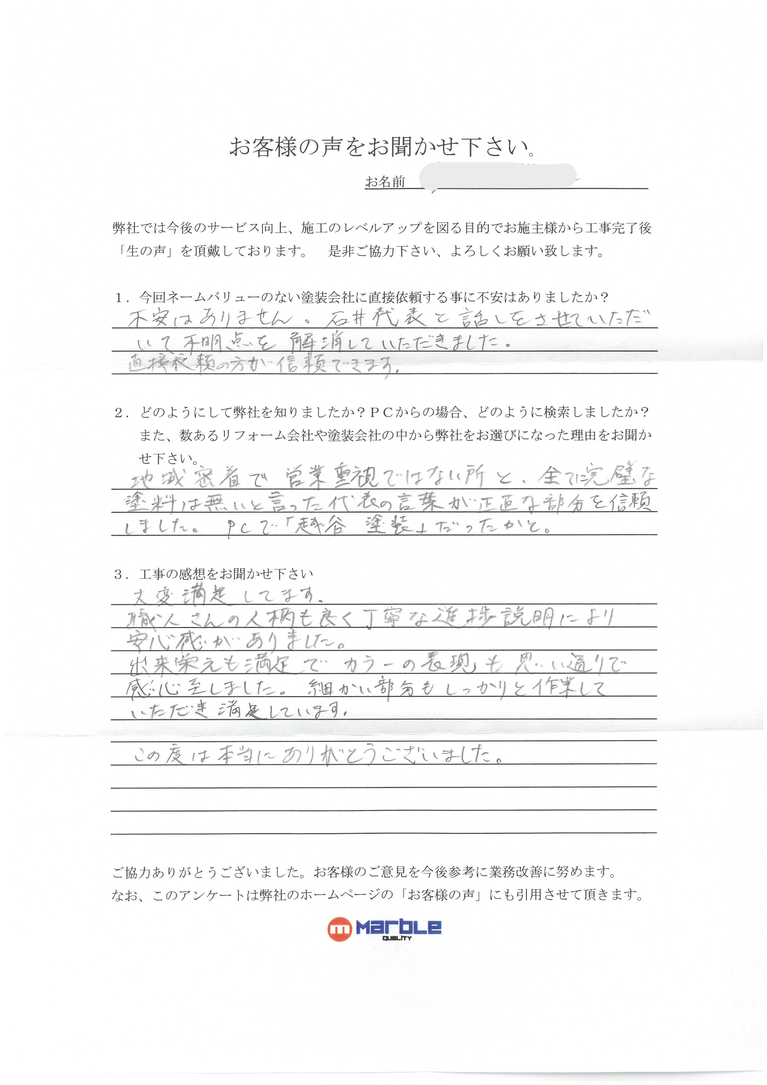 地域密着で営業重視では無い所と、全てに完璧な塗料は無いと言った代表の言葉が正直な部分と信頼しました。PCで「越谷 塗装」だったかと。