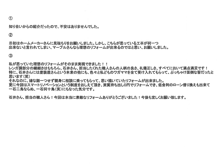 それなのに、嫌な顔一つせず親身に相談に乗ってもらって、思い描いていたリフォームができました。さらに今回はスマートリノベーションという制度を教えていただき、実際持ち出し0円でリフォームでき、低金利のローン借り換えもできて一石二鳥ならぬ、一石何十鳥(笑)にもなった気分です。