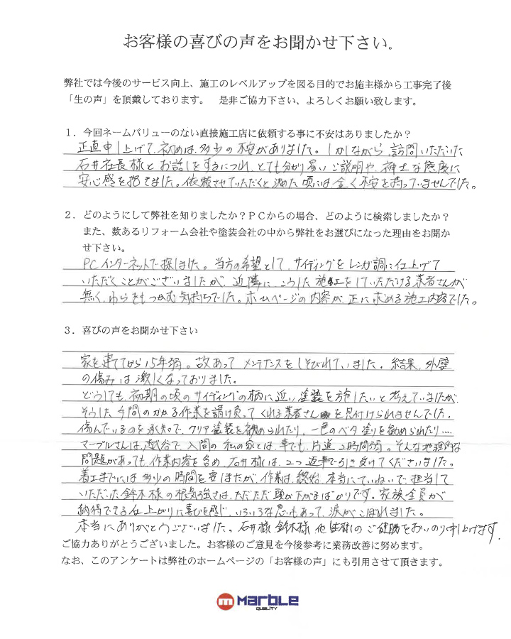 どうしても、初期の頃のサイディング柄に近い塗装を施したいと考えていましたが、そうした手間のかかる作業を請け負ってくれる業者さんを見つけられませんでした。傷んでいるのを承知で、クリア塗装をすすめられたり、一色のベタ塗りをすすめられたり…。マーブルさんは越谷で入間の私の家とは車でも片道2時間弱。そんな地理的な問題もあっても作用内容を含め、石井様は2つ返事で引き受けてくださいました。着工までには多少の時間を要しましたが、作業は終始本当に丁寧で担当していただいた鈴木様の根気強さはただただ頭が下がるばかりです。