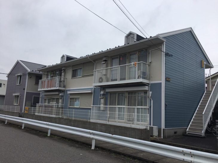 屋根は数年前に塗装されたという事で外壁のみの施工となりました。 2棟が並ぶアパートで全体的に白基調の外壁を若者ウケする様にカラフルにオシャレに!と色彩計画はお任せでご依頼頂きましたので、色選びから楽しませて頂きました(^^)/ |