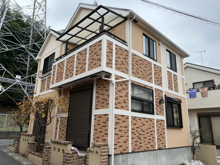 | 使用商材 | 屋根:サンフロンルーフ(新コーヒーブラウン)、外壁:単色部ナノコンポジットW(17-80H、ND-461)レンガ調部ランデックスコートP-5000(各指定色)、付帯部:サンフロンUV、ナノコンポジットW(15-90B、17-80H)、その他 |