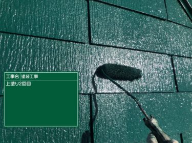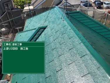 | 使用商材 | 屋根:キクスイSPパワーサーモF(ダークグリーン)、外壁:ナノコンポジットF(メイン69-40D、アクセント19-70C)、付帯部:サンフロンUV、ナノコンポジットF(N-93)、カルセラ、その他 |